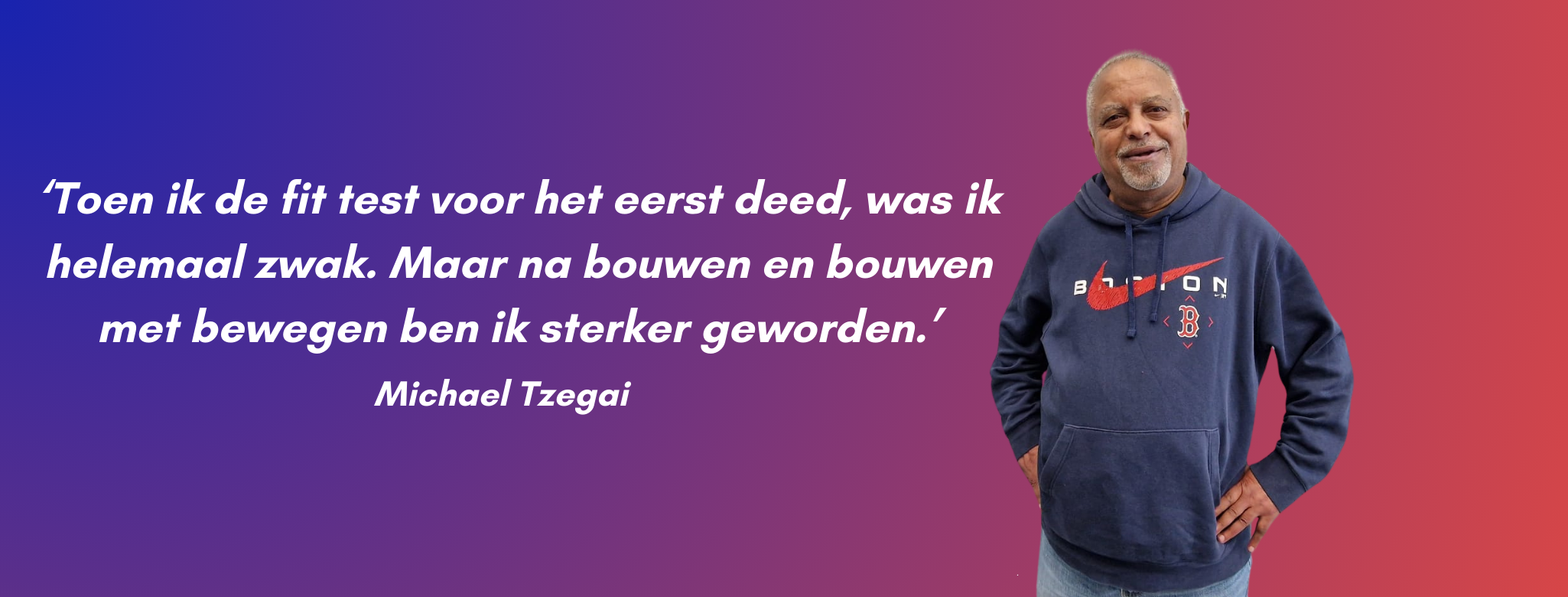 De boodschap die Michael zou geven aan anderen als hij hen mocht uitnodigen om deel te nemen aan de dag: ‘Ik ga advies geven aan mensen van mijn leeftijd. Voor mensen van mijn leeftijd is dit echt heel belangrijk. Voor jonge mensen ook, maar voor mensen van 50+ en 60+ al helemaal. Toen ik de fit test voor het eerst deed, was ik helemaal zwak. Maar na bouwen en bouwen met bewegen ben ik sterker geworden.’
