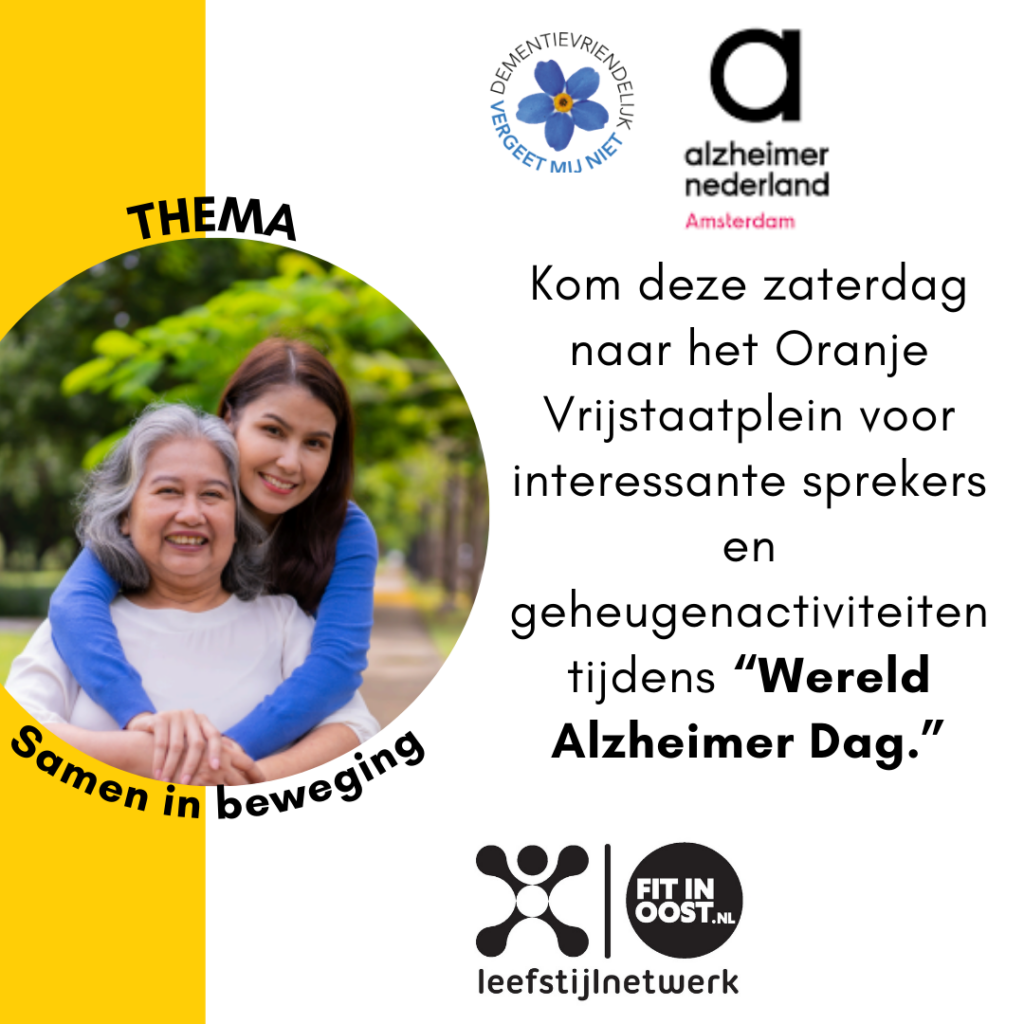 Wereld Alzheimer Dag wordt in Amsterdam Oost georganiseerd door St. Prachtvrouw, Diversiteitsland, Dynamo Amsterdam, Odensehuis Amsterdam, Zorggroep Amsterdam Oost, Team Sportservice, Fit in Oost en de Gemeente Amsterdam.