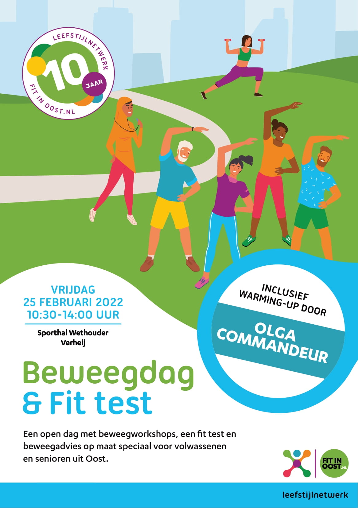 Yes! We zijn blij, want we mogen jullie weer uitnodigen voor de eerste ‘Beweegdag & Fit Test’ van 2022! En omdat we dit jaar ons 10-jarig jubileum vieren, hebben we tijdens deze beweegdag niemand minder dan Olga Commandeur uitgenodigd om de warming up te komen verzorgen. Meld je snel aan en zorg dat je dit niet mist!