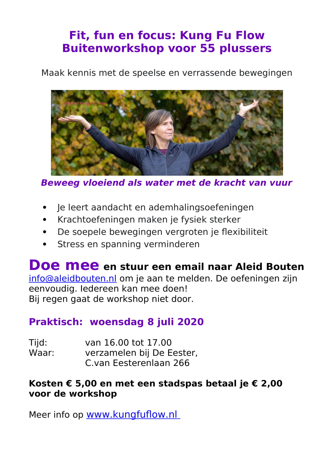 Wil je meedoen, meld je dan vooraf even aan (verplicht) door een mailtje te sturen aan info@aleidbouten.nl . Wil je voor die tijd meer informatie over Kung Fu Flow? Neem dan alvast een kijkje op de website www.kungfuflow.nl .