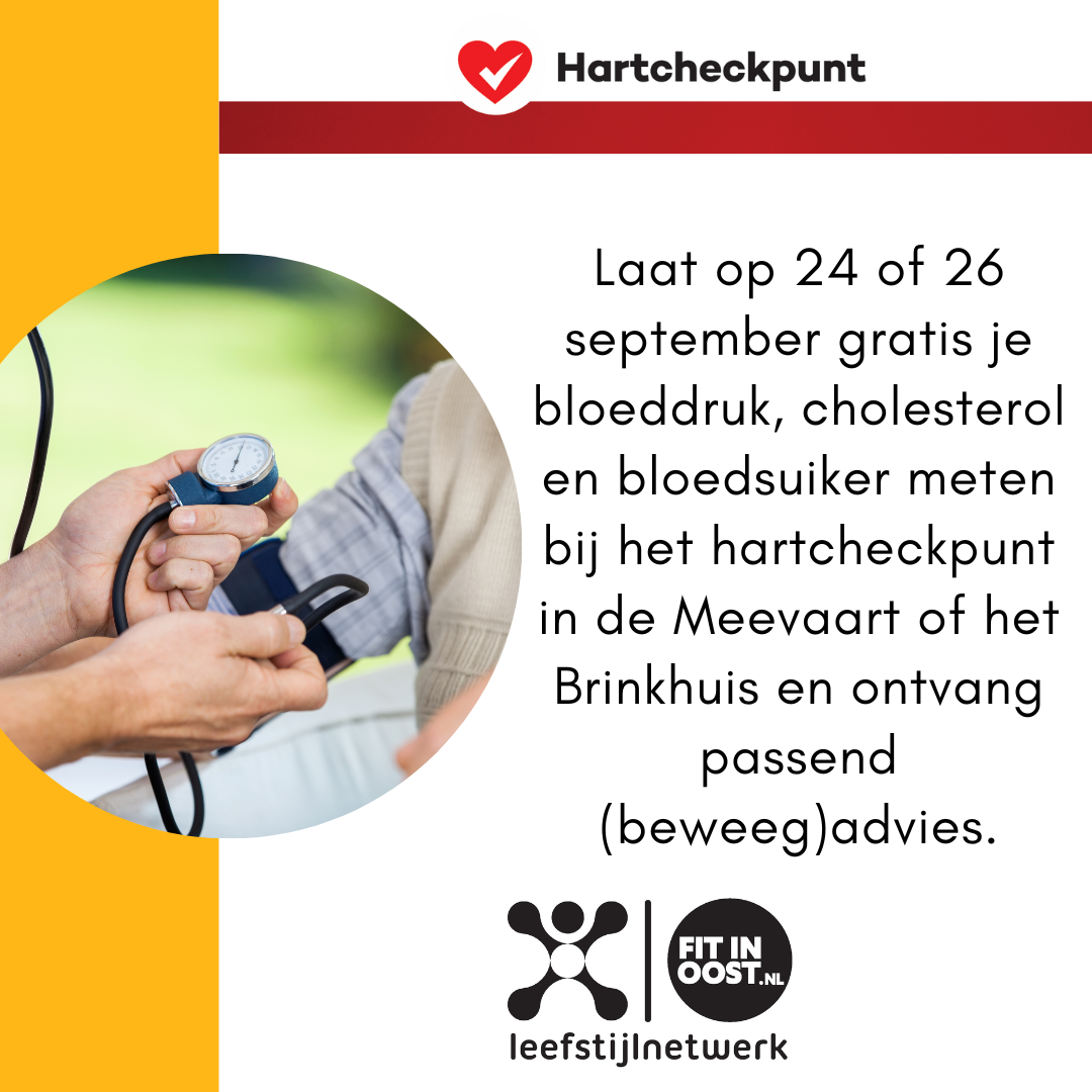 Na het succes in juni is de Hartstikke gezondweek dit najaar terug in Oost. Ben jij tussen de 40 en 70 jaar, heb je (voor zo ver bekend) geen hart- of vaatziekten en gebruik je geen medicijnen voor bloeddruk, cholesterol of bloedsuiker? Kom dan naar de gratis hartcheck op woensdag 24 september in het Brinkhuis of op vrijdag 26 september in de Meevaart!