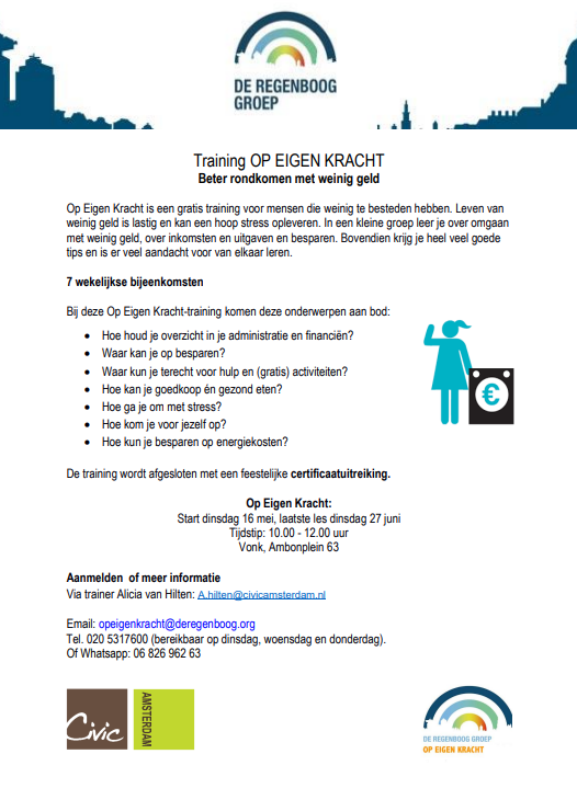 Op dinsdag 16 mei start Civic Amsterdam in samenwerking met De Regenboog Groep de gratis training “Op eigen kracht“. De training is speciaal bedoeld voor iedereen met een kleine(re) beurs en is een combinatie tussen leren budgetteren, groei in persoonlijke ontwikkeling en het inspiratie opdoen op het gebied van een gezonde leefstijl.