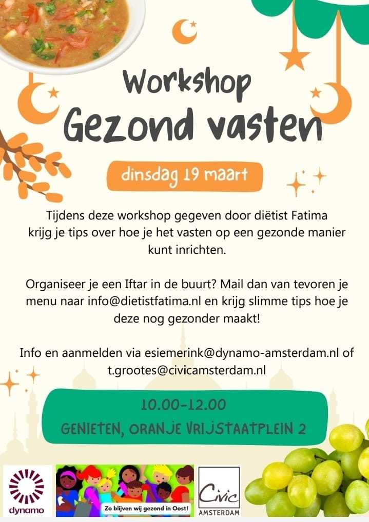 (Deze workshop is een initiatief van Zo Blijven wij Gezond in Oost, Dynamo Amsterdam, Civic Amsterdam en Diëtist Fatima.)