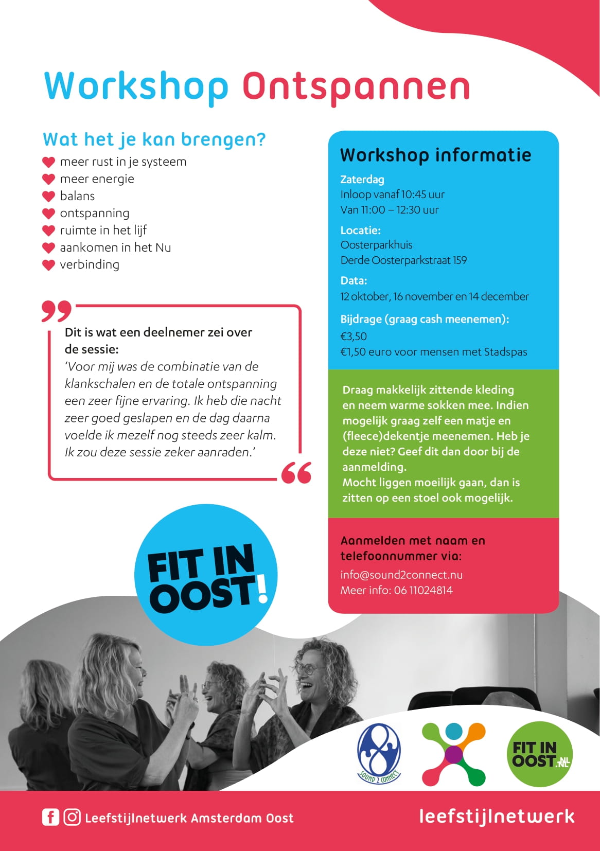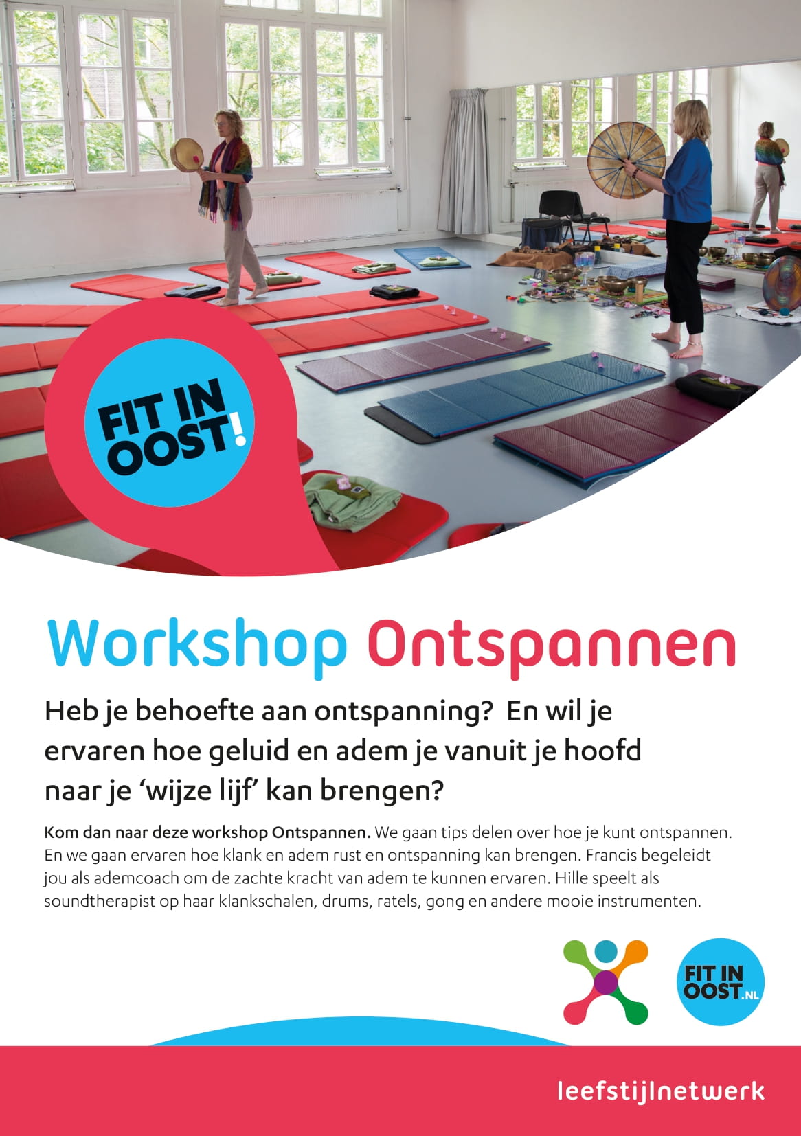 Wil jij ook meer ontspanning ervaren? Kom dan naar de workshop(s) “Ontspannen” van Hille & Francis. Tijdens de workshop ga je aan de gang met klank, adem en rust om een zo fijn als mogelijke staat van ontspanning te ervaren. Wees welkom!