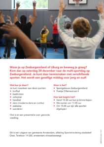 Op zaterdag 28 december van 11:00 – 15:00 uur (inloop vanaf 10:30 uur) kunnen jong en oud in sportgebouw Zeeburgereiland gratis samen sporten en een presentatie over gezonde voeding bijwonen. De volgende sporten kan je allemaal komen proberen: