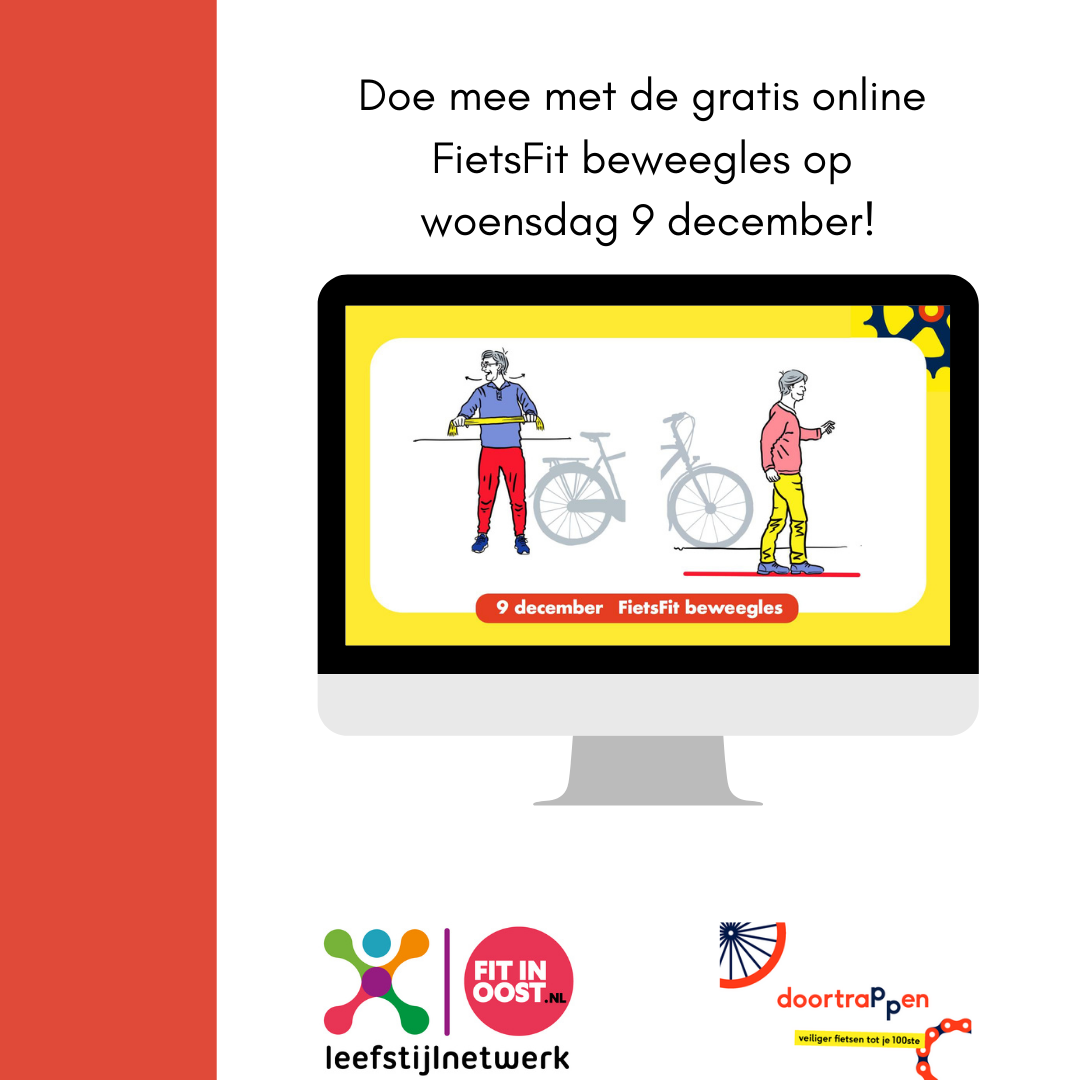 De beweegles is voor iedereen live te volgen op woensdag 9 december om 15:00 uur. Het enige wat je nodig hebt is een Facebookaccount, een laptop/tablet, internet en een flesje water. Om een melding te ontvangen zodra de beweegles begint, zet je jezelf op aanwezig/geïnteresseerd bij het Facebookevenement ‘Online FietsFit beweegles’ van Doortrappen gemeente Amsterdam.