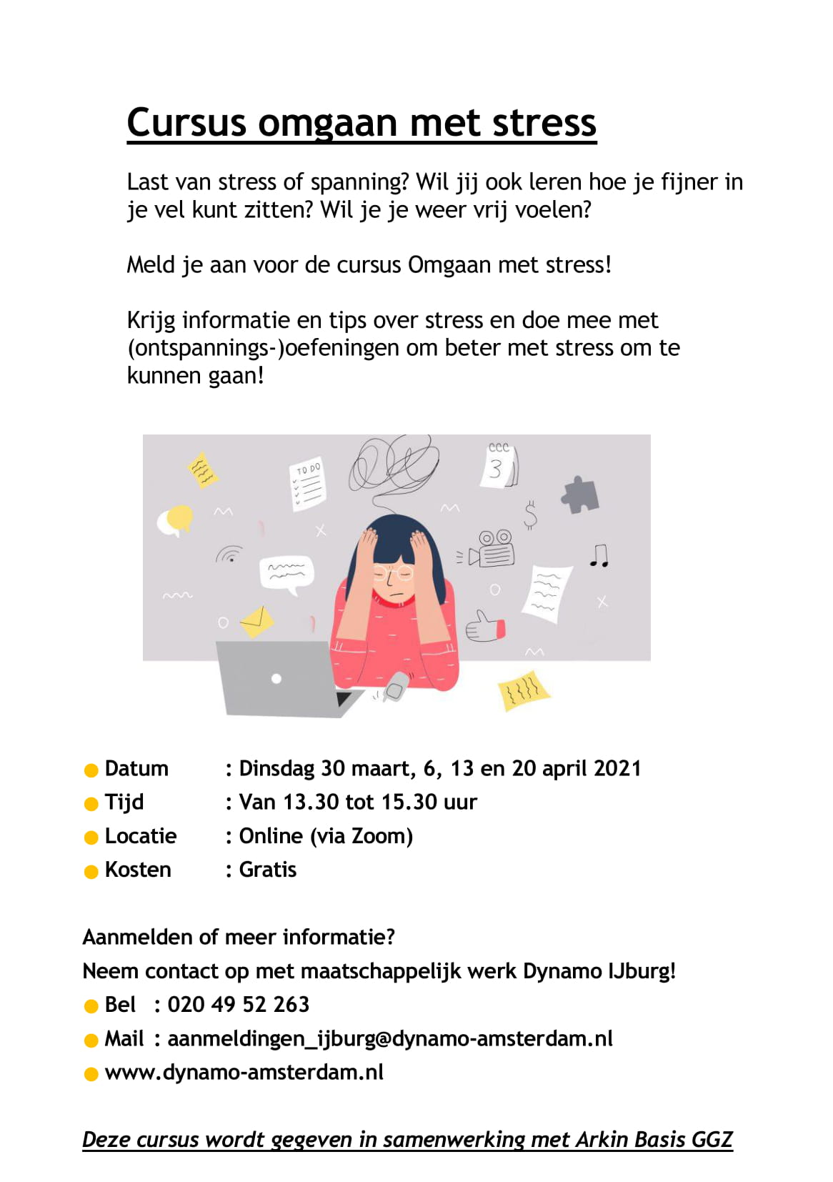 Ervaar jij ook stress en spanning en zou je het fijn vinden om weer lekkerder in je vel te zitten? Wil je meer weten over stress, hoe je het kan voorkomen en welke ontspanningsoefeningen hier aan kunnen bijdragen zodat je weer vrij van stress kan leven? Doe dan mee met de gratis online cursus ‘Omgaan met stress’ van Dynamo Amsterdam & Arkin. Tijdens 4 online bijeenkomsten krijg je informatie en handvaten toegereikt die je helpen om beter om te gaan met stress.