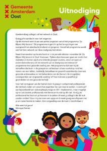 Ben jij als professional (vrijwillig en/of betaald) actief in Amsterdam Oost en lijkt het jou leuk om mee te denken over de invulling van de “Zo Blijven Wij Gezond in Oost-Karavaan” die van oktober t/m november van start gaat? Neem dan snel contact op met Monique Dames door haar een mailtje te sturen naar monique.opeigenwijze@gmail.com en wie weet draag jij binnenkort met jouw idee bij aan een nog gezonder Amsterdam Oost!