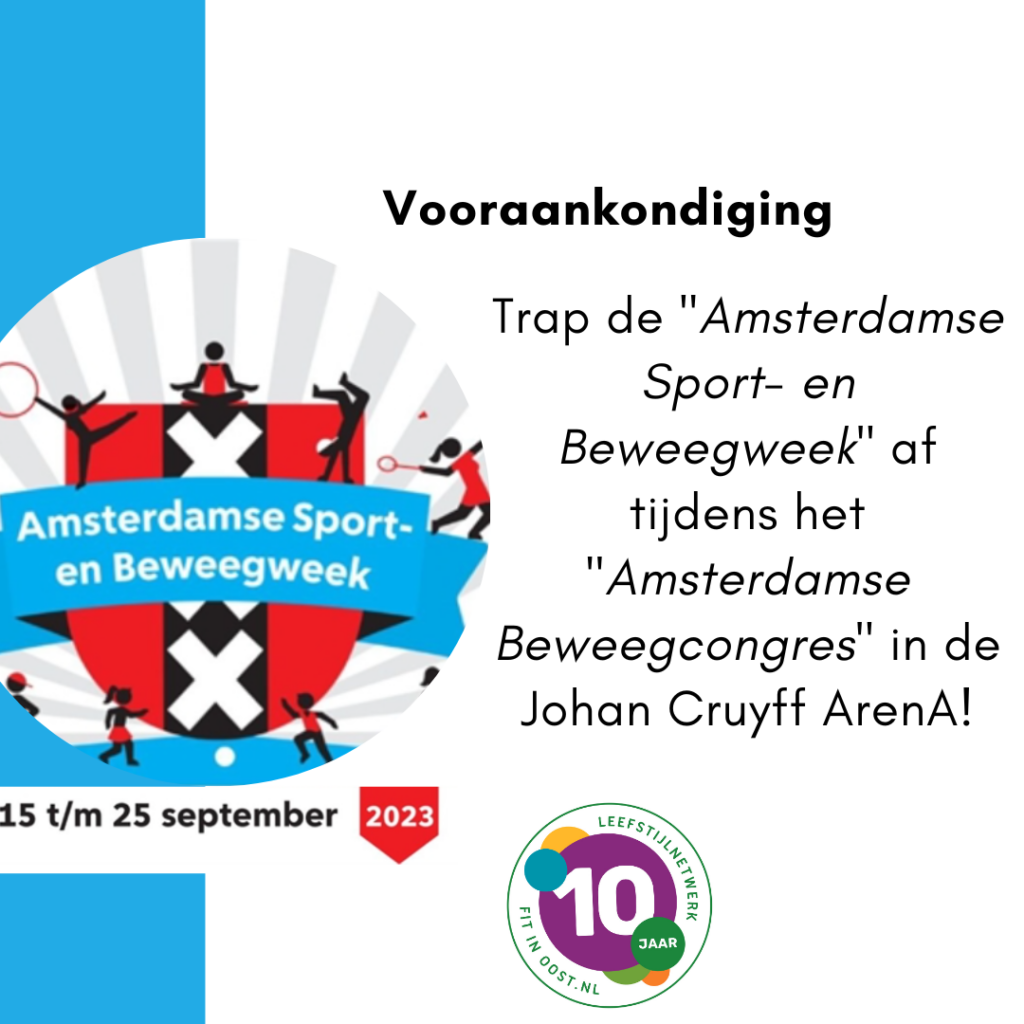 Hoewel er nog een heleboel weken vol aan zomer beweegaanbod voor ons liggen, kan het geen kwaad om alvast een vooraankondiging te doen voor september. Van 15 t/m 25 september 2023 vindt namelijk de “Amsterdamse Sport- en Beweegweek” plaats en jij kan er als sport- en beweegaanbieder bij zijn!