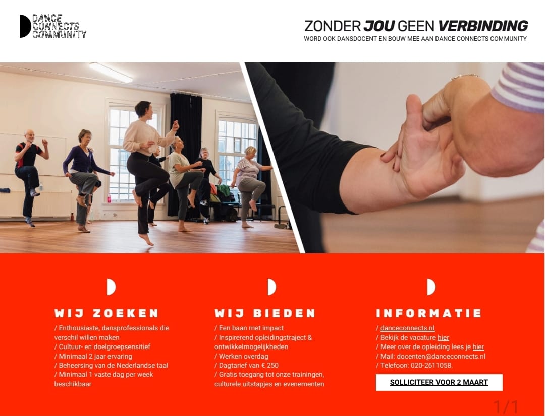 (Alle informatie over de vacature lees je op de website van Dance Connects.)